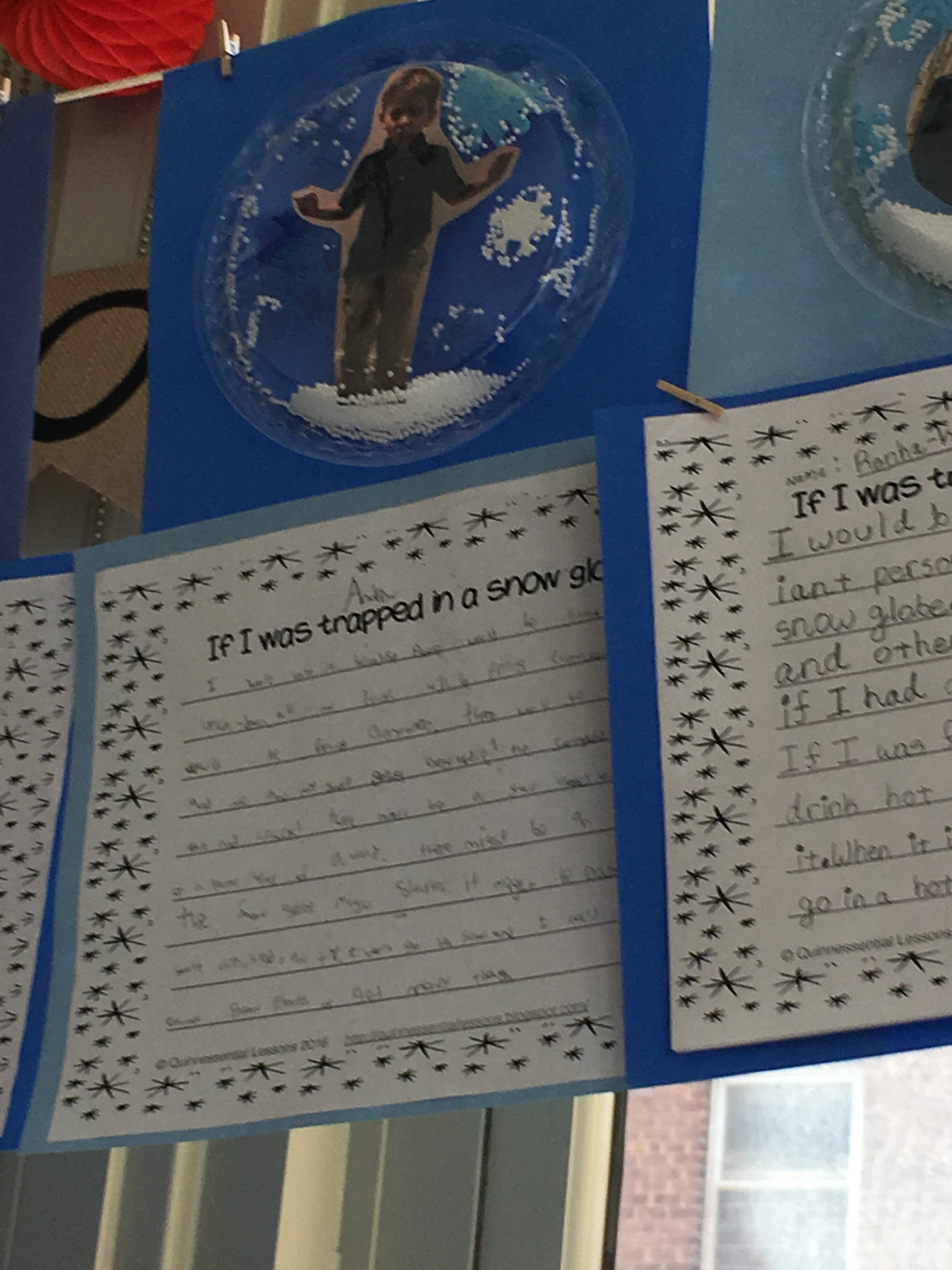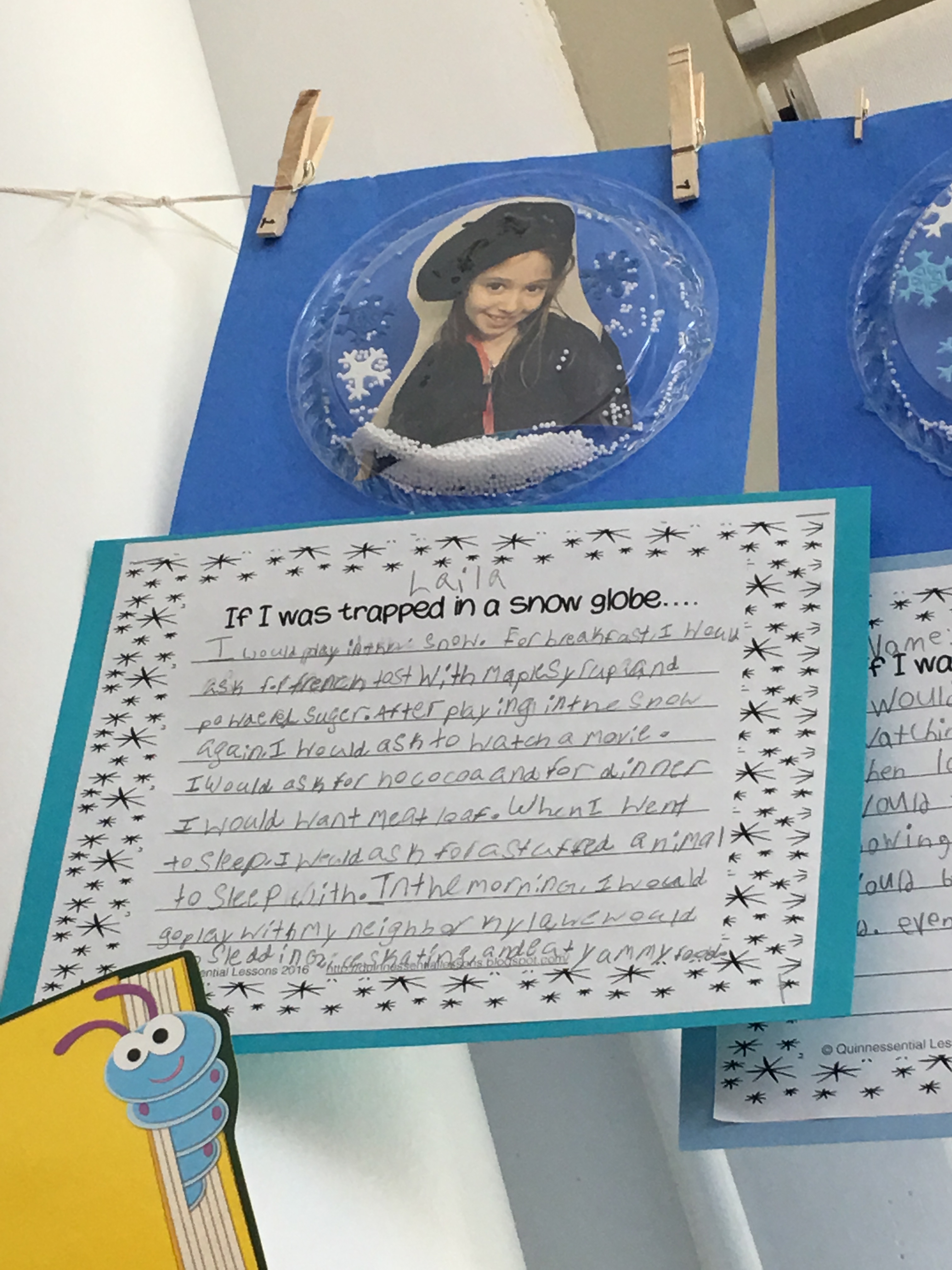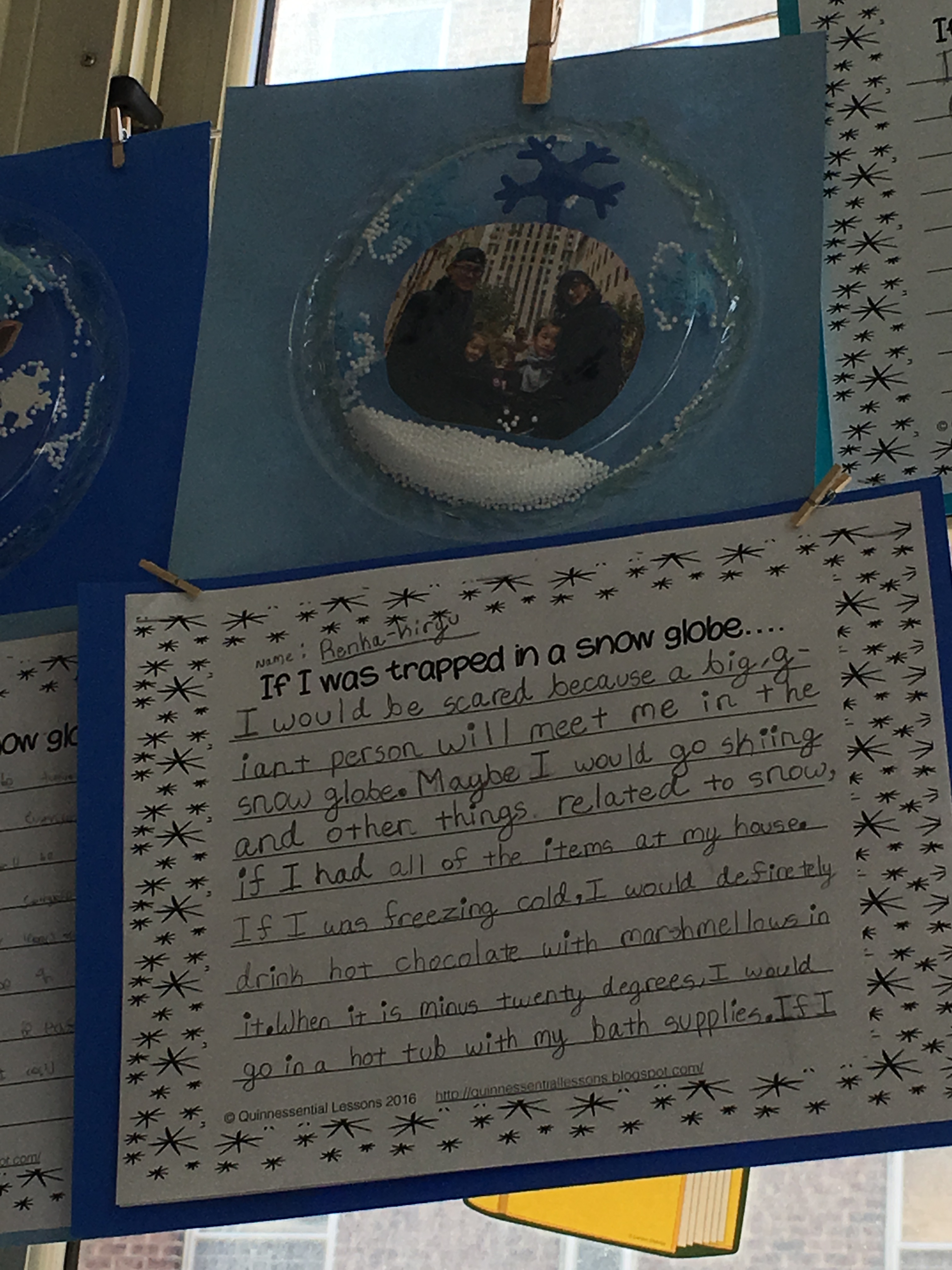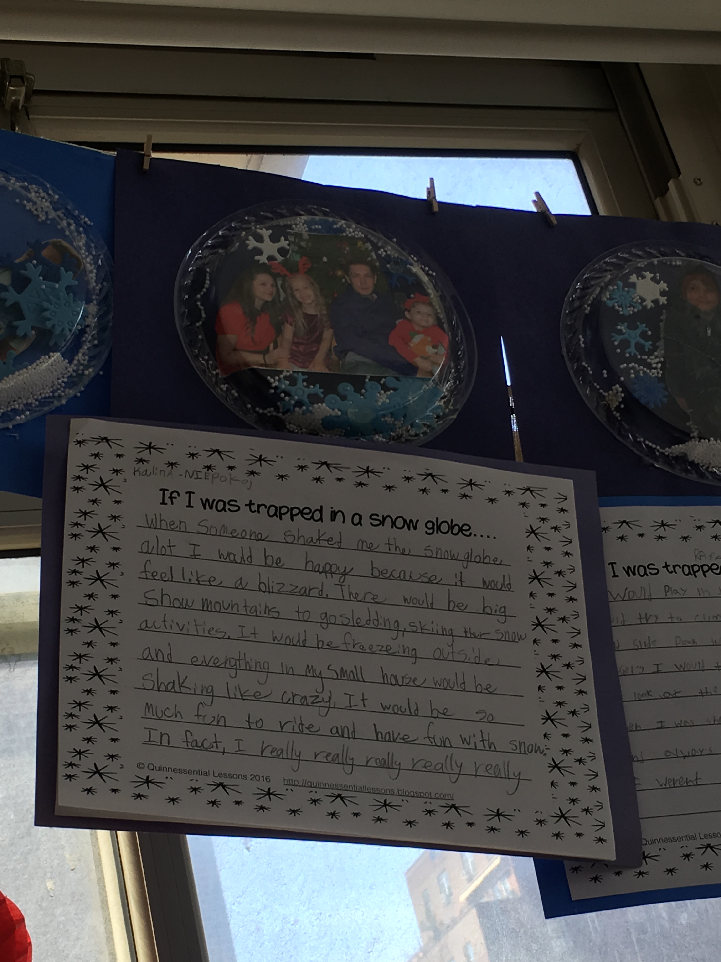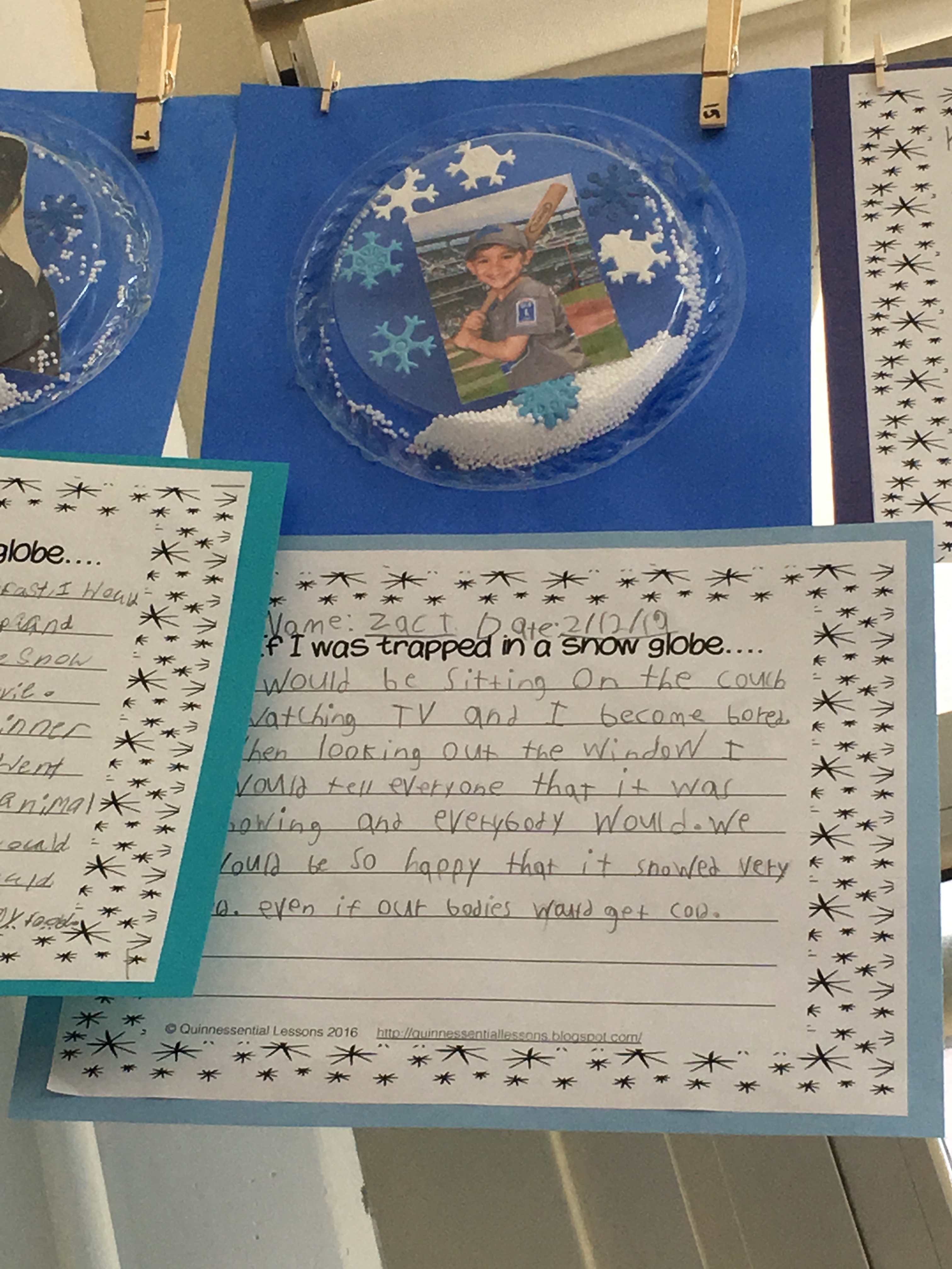 We read the timeless and fun story, The Snow Globe Family, written by Jane O’Conner. It tells the story of a little family who live in a snow globe and long for a swirling snowstorm. They hope that someone will give the snow globe a big shake and when the baby comes into the room, they just might get their wish! Students were asked to write their own short story with the sentence starter, “If I were trapped in a snow globe…” Some students chose to bring in pictures of themselves and create a snow globe of their own utilizing plastic plates, fake snow, and a whole lot of creativity and fun!