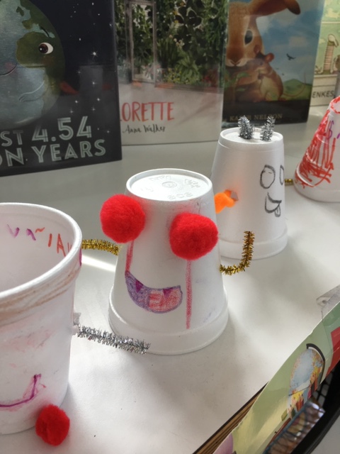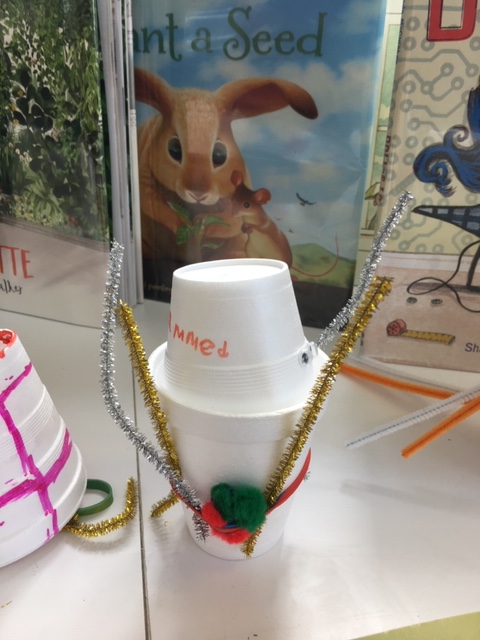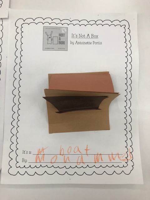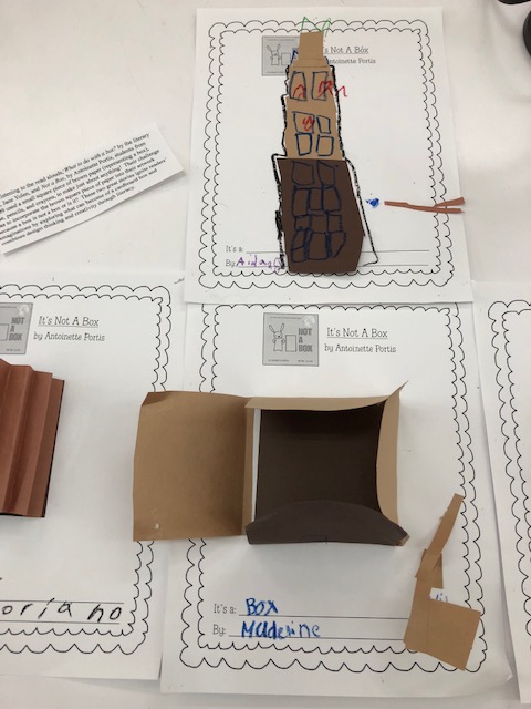 I thought it would be interesting to combine popular and fun read-alouds with STEM/Makerspace activities since 2-409 loves to be creative and imaginative. After reading Doll-E 1.0 by Shanda McCloskey, a STEM friendly story of a girl and the doll she upgrades, students had to create their own “robots” using foam paper cups, pompoms, pipe cleaners, googly eyes, and other materials. To continue the excitement and interest, in the next library session, we read several picture books around the theme of “boxes” such as, Not a Box, by Antoinette Portis, and What To Do With a Box, by Jane Yolen. Students were tasked with coming up with artwork that utilized simply a square piece of brown construction paper that represented a “box.” It is always a pleasure to see students’ imaginations soar when you combine “making” with “reading”.