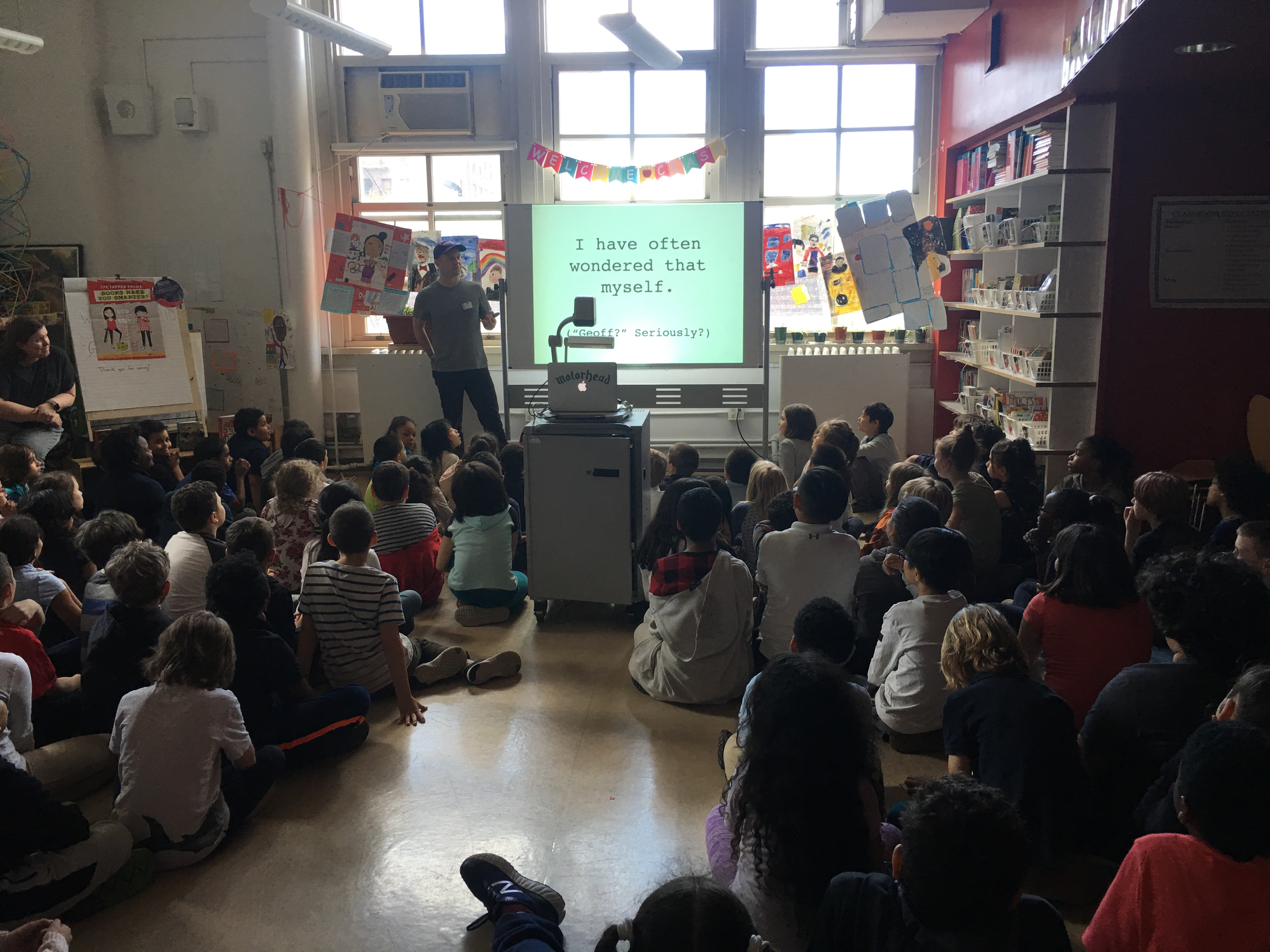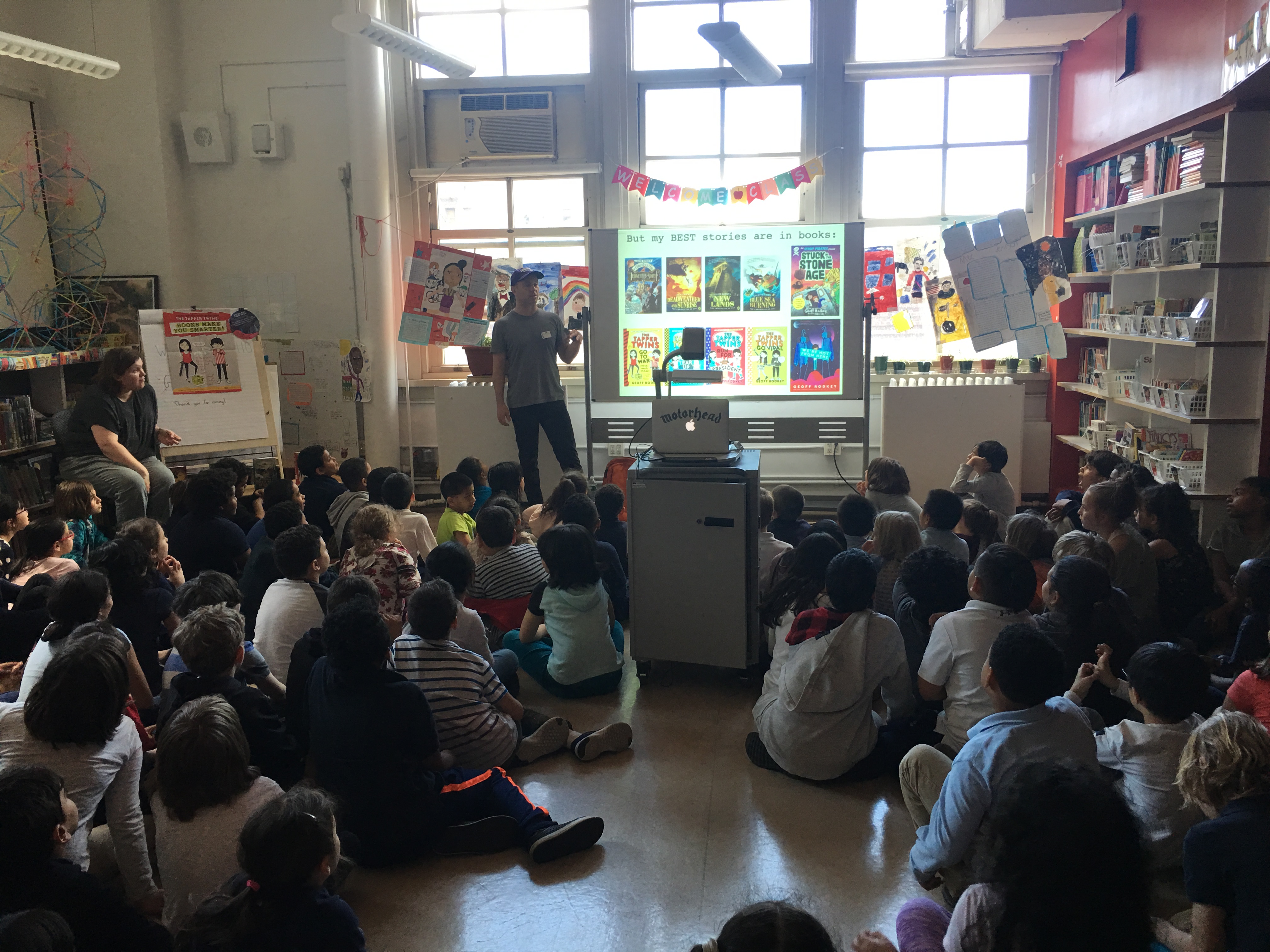 P.S.110 was honored to host, Geoff Rodkey, the author of several popular upper elementary books like the Tapper Twins series and We’re not from here! and screenwriter of RV and Daddy Day Care. There was not an open seat in the library and one could feel the excitement of the students in the air for this epic and memorable visit. Geoff Rodkey gave a wonderful and informative presentation for our students in grades 3-5 and even returned for a second brief visit to personally autograph his books (book order technical difficulties). He was not only professional in his manner, but beyond kind and sweet- thank you Geoff!